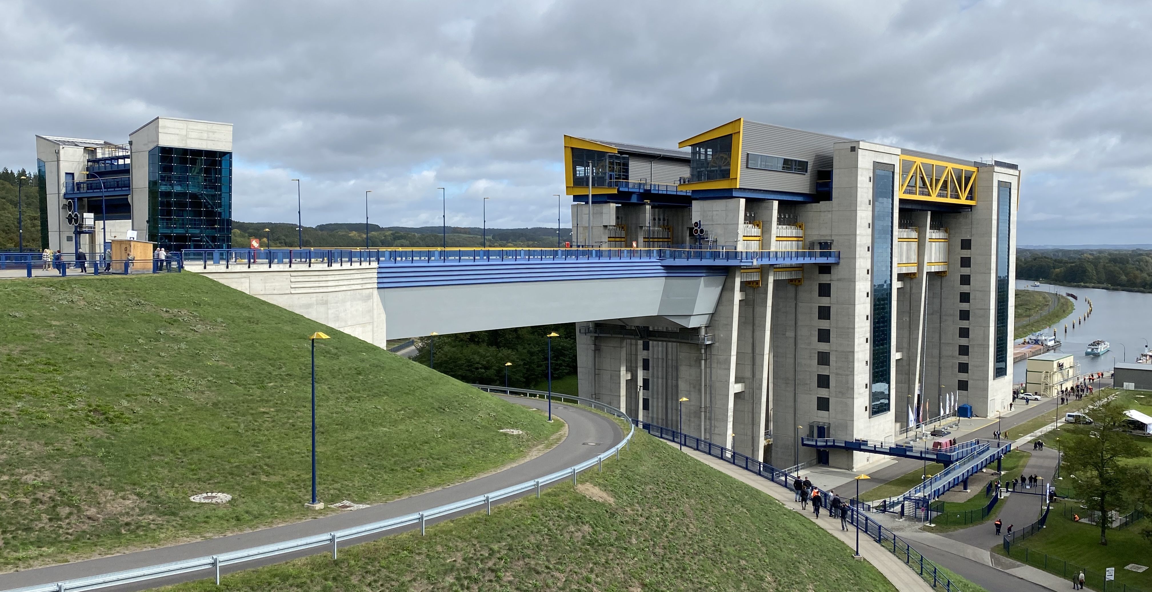 36 meters height difference in about three minutes: That's what the new Niederfinow boat lift on the Oder-Havel Canal in Brandenburg can do. The new trough will be able to transport inland vessels with a total length of 110 meters and weighing up to 2,300 tons. On October 4, 2022, the ship lift will officially go into operation after 14 years of construction.