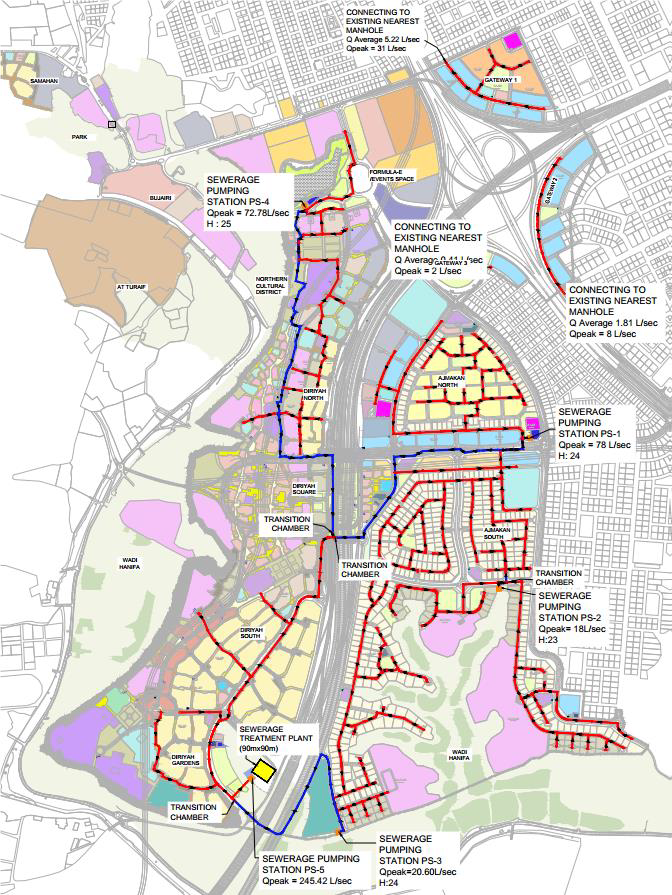 The infrastructure package includes all wet and dry utility networks and supporting infrastructure. Major plant facilities includes sewage treatment plant, primary substations, district cooling plants and associated networks and vacuum waste management systems.