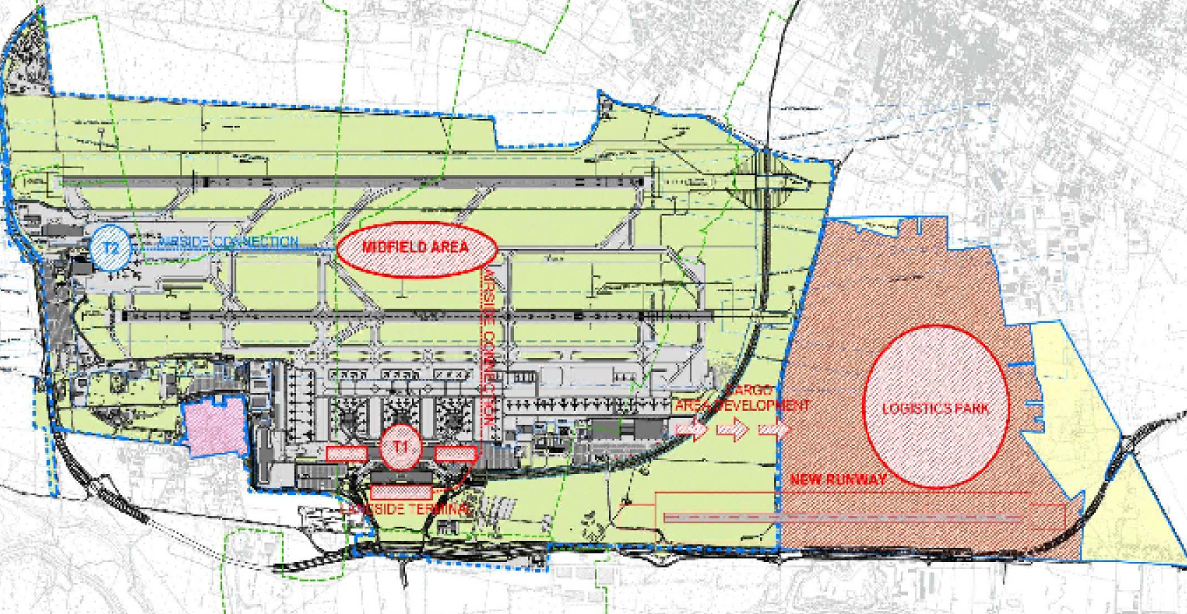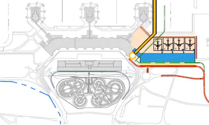 Aim of the further design and study is the definition of a suitable location for a landside terminal, the satellite with adjacent aprons itself, extension and connection with the existing baggage handling system, the reorganisation of the landside access, the expansion of the cargo facilities, the connection and reorganisation of the whole airside taxiway system and finally the land use plan for the whole airport.